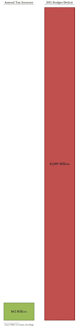 The deficit is the red bit on the right, and the solution of taking from the rich is the green part on the left. See, we fixed it. Problem solved! We can get back to normal now and carry on borrowing $.46 of every $1.00..